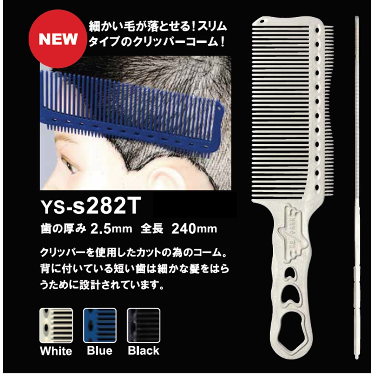 『フラットトップコーム YS-282』(ZU-2271N-X)よりも歯が薄いためボディが柔軟で、頭皮に近いカットに適したコームです。