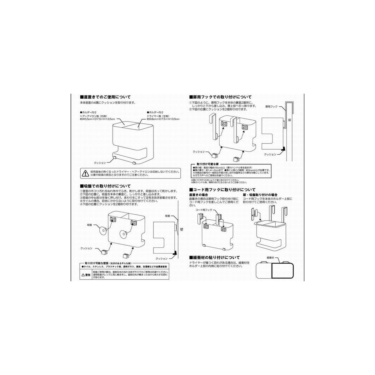 ドライヤーとヘアーアイロンを同時に収納。扉や鏡にも取り付け可能。